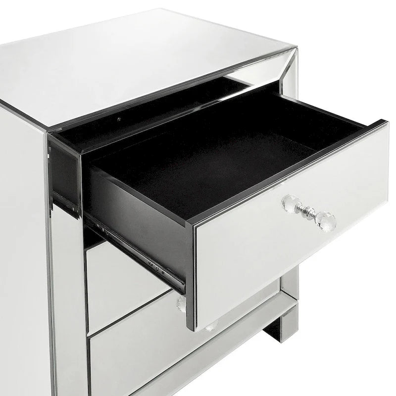 The contemporary Esmond Mirrored Accent Table from iNSPIRE Q Bold showcases a distinctive style for an intriguing look. This mirrored end table is the perfect addition to your living room, bedroom, or office. It's functional and beautiful with its mirrored front, sides, and top. This Esmond table makes a great accent piece for any style with its sleek, modern look. It has 3 drawers for storage, and decorative clear crystal drawer handles. With mirrored front and sides, the design is perfect for your style.