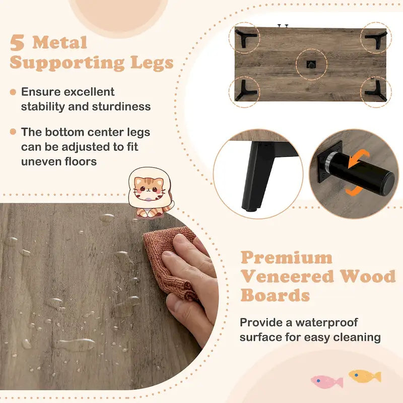 Indulge Your Cat in a World of Luxury and Exploration with This All-in-1 Cat Retreat!Our innovative cat cabinet furniture combines the functions of cat litter box enclosures and cat trees, providing a multifunctional haven for your beloved feline. There are 3 scratching posts, a hidden cat washroom, and a cat condo, offering ample space for your pet to play, scratch, relax, and toilet. The double-door cat litter box enclosure can not only provide privacy and convenience for kittens, but also minimize odors and prevent litter from scattering. Other than that, the scratching posts are covered by natural sisal ropes, making sure they are safe for your furry friends to grind paws.